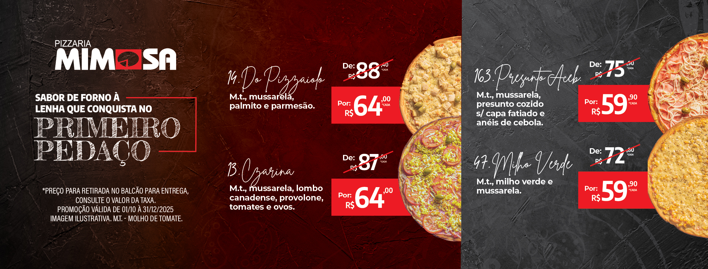 Desde 1990 a Pizzaria Mimosa prepara diaramente pizzas com muito carinho. Desde a escolha dos ingredientes, o preparo e a montagem, tudo é feito com muita dedicação. Utilize o menu ao lado para conhecer nossas pizzas e faça seu pedido!